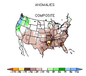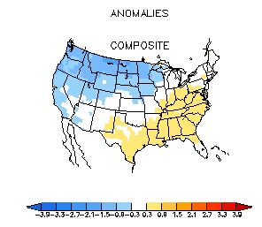 Now what about temperature? Turns out there is little temperature signal for La Nina years during fall, but during winter (January-March) we are colder than normal, as shown in this graphic: