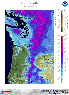 12. You mention that "the Cascade passes have received a lot of snow (3-4 feet) during the past week." In fact, the "New snow" column for lowly (in terms of elevation) Snoqualmie Pass shows that since last Sunday (1/15) they've received 87 inches of new snow. And that's at road level (I-90); there's been considerably more than that on the upper reaches of Alpental, for example. See http://i90.atmos.washington.edu/roadview/i90/ and click the "Snow depth" link.