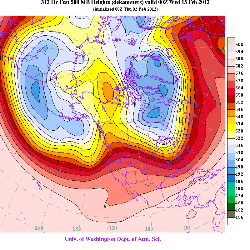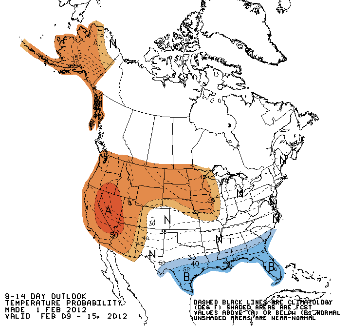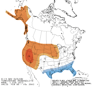On one hand there is the well-known frogprognosticator of Snohomish, Washington--otherwise known as the GroundFrog. At a solemn ceremony on Saturday, the wise frog predicted good weather for the remainder of the winter for the Northwest--a prediction that is consistent with the latest two-week forecast of the National Weather Service's Climate Prediction Center for the western U.S. shown below. Red indicates temperatures above normal. No snow worries here.