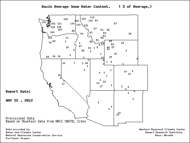 But we have a really good snow pack and lots of water for this summer. Here is the latest snow pack in terms of percentage of normal. Most of Washington State is well above 100%--much of it above 150%. Northern Idaho and western Montana is in decent shape too. But the situation to our south is very poor...15-20% in the central Sierra, and in the teens and single digits in Utah and Colorado. The Colorado River will be running real low this year.