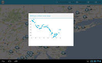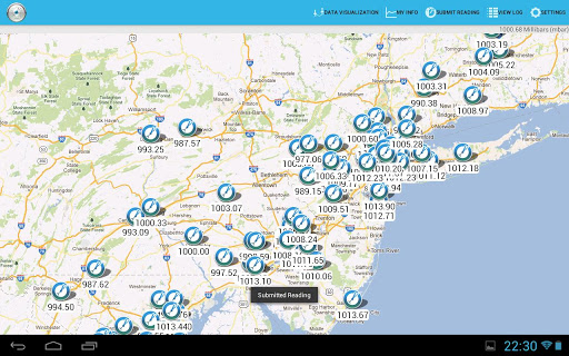 pressure observation and your location (smartphones use GPS and/or cell phone tower triangulation) to a central database, and allows you to view the observations taken by others. Here is a screenshot of the graphics provided by the app: