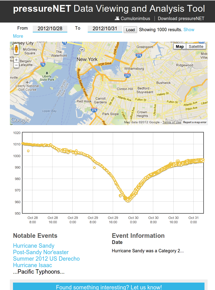 I have been talking to the developers of PressureNet2 and they said that thousands of folks signed up for their app before and during Hurricane Sandy hit the East Coast. Here is a plot of the smartphone pressure observations for an area of New York City during landfall. Amazing....you can see the pressure minimum and the calibrations were really quite good.