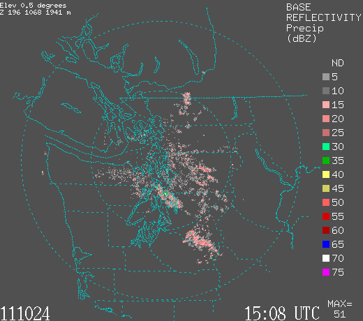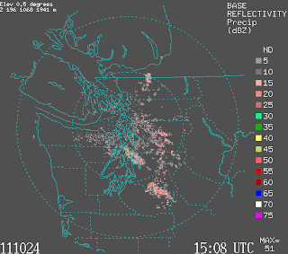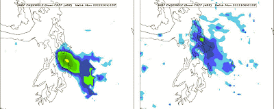 Even better a number of research groups include those at the UW are studying the use of new data assimilation methods to take advantage of pressure observations. (data assimilation is the combination of models and observations to produce the best possible three dimensional descriptions of the atmosphere. Data assimilation provides the starting point of weather forecasts done by computers). With Professor Greg Hakim and Graduate Student Luke Madaus we are testing the use of advanced ensemble-based data assimilation using surface pressure, with sophisticated quality control of the pressure observations. Here is an example of a Puget Sound convergence zone. You can see the radar an area of heavy precipitation over Seattle.