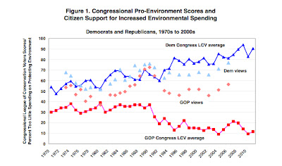 And perhaps most of disturbing of all, this scientific issue has become a political football, with Republicans and Democrats increasingly divided on this and other environmental issues. Recently I went to a talk by Harvard Professor Theda Skopol in which she showed a figure on the environmental voting records of the two parties (see below) and it was stunning. Before roughly 1992, both parties had a middle of the road stance, with Democrats being modestly more likely to support environmental spending. But during the last few years, the differences have become profound (roughly 90% for Democrats, 10% Republicans). Talk about polarization.