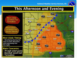 For several days before, based on a range of numerical forecast models and substantial knowledge of severe thunderstorms, the National Weather Service forecasters at the Norman, Oklahoma NWS office and staff at the NOAA/NWS Storm Prediction Center (SPC) had predicted the threat of severe thunderstorms on Monday over Oklahoma. Here is the graphical outlook for severe convection released on Sunday. Central and eastern Oklahoma was clearly in a high risk area.