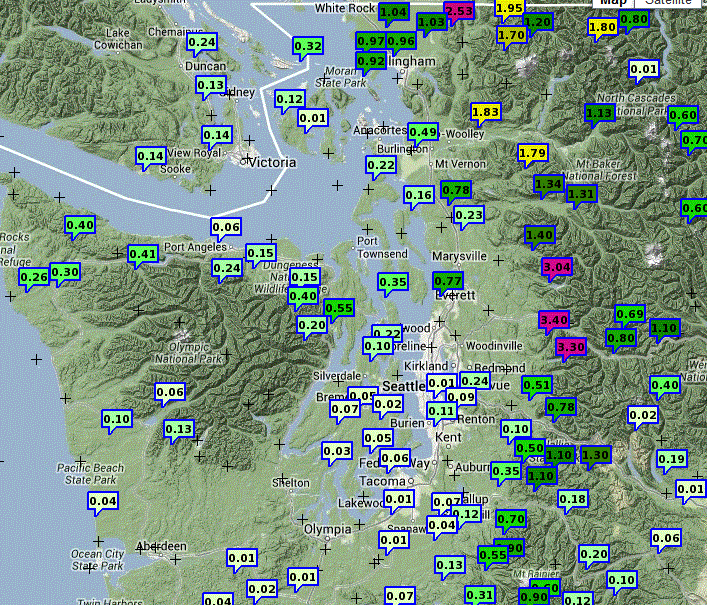 Here are the 24-h totals ending 8 PM Thursday for western Washington. Some folks on the western slopes of the north Cascades got over 3 inches, and .5 to 1 inch totals were widespread. But only a few hundredths over the southern Sound.