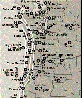 The Northwest may not get hurricanes, because our water is too cold, but our strongest cyclones have winds equaling that of category 1 or 2 hurricanes, and our storms are far larger in size. Our shores are no stranger to 100 mph winds, as illustrated by the recent December 1-3, 2007 coastal gale (see map)