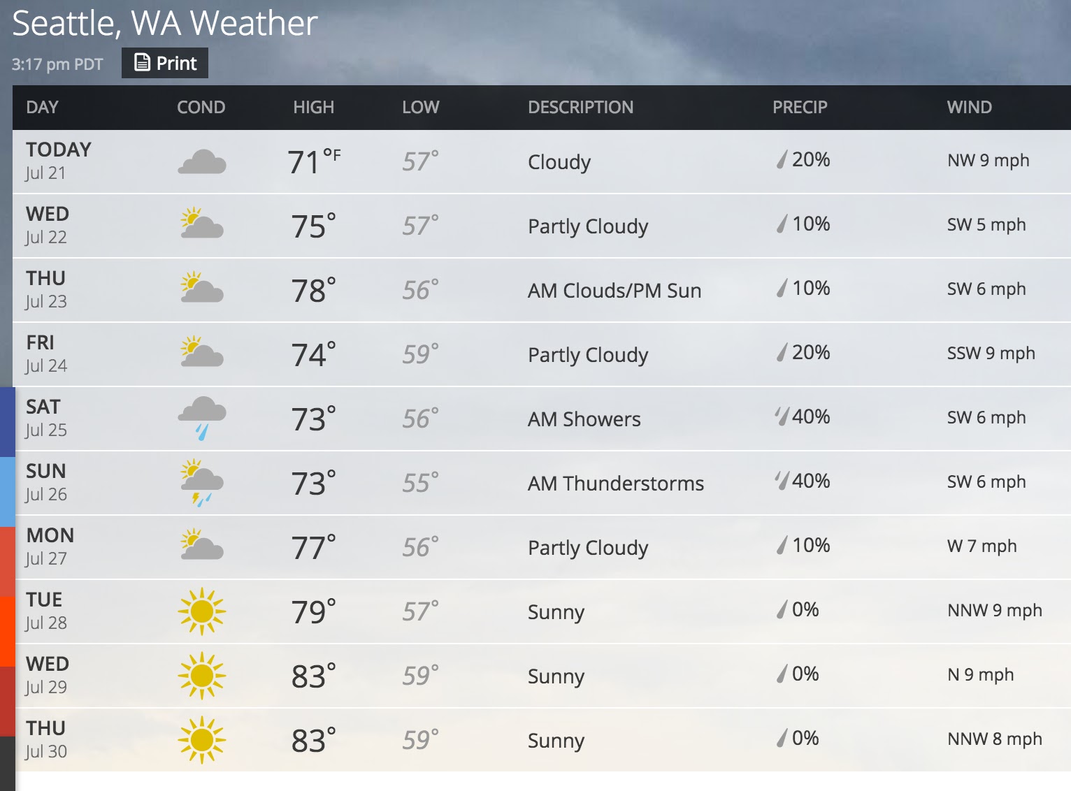 Here is their forecast for the next 10 days for Seattle. For the next week, lots of temps in the 70s. Very typical, but the chances for showers increases late Friday and on into the weekend as an upper trough moves through. My apologizes to all brides with outdoor weddings.