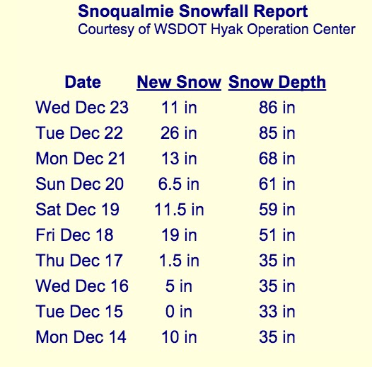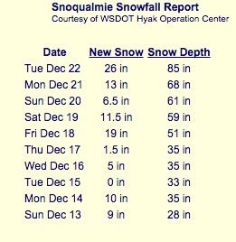 Every day at 6 AM, Washington Department of Transportation measures snow depth in the pass. Here are the latest numbers. 26 inches of snow between 6 AM Monday and 6 AM Tuesday, with 85 inches on the ground. An increase of 50 inches in 5 days. To quote Darth Vader: Impressive, Most Impressive.
