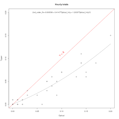 Some of the first results are shown below (courtesy of Neal Johnson of my department). The x-axis shows hourly precipitation from the new unit and the y axis is the amount from a traditional tipping bucket gauge. Not terrible, but the new unit seems to overdo the rainfall for heavier amounts (a perfect match would be found along he red line) We hope to get more of these units and see if we can determine and apply a reasonable calibration to them.