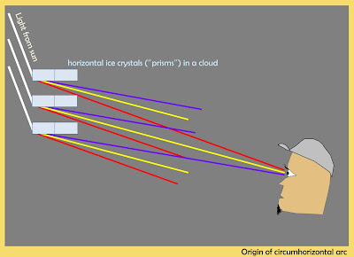 3. Not a sun dog. See http://www.atoptics.co.uk/halosim.htm for everything you ever wanted to know (and then some) about ice-crystal halos. There is a whole zoo of different halos, all caused by varying types of crystals and sun-observer geometry. The complex displays with a multitude of halos are rare and amazing events, but the CHA (subject of this blog post) is fairly common.
