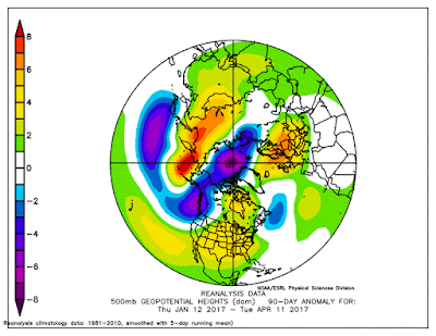 To illustrate, here is upper atmospheric (500 hPa, around 18,000 ft) anomaly (difference from normal) of 500 hPa heights (you can think of it like pressure) for the last 90 days. Huge anomaly, with unusually low pressure over the Northwest and offshore waters, a big ridge (high pressure) over the eastern U.S. and the southern NE Pacific, and other large anomalies offshore.