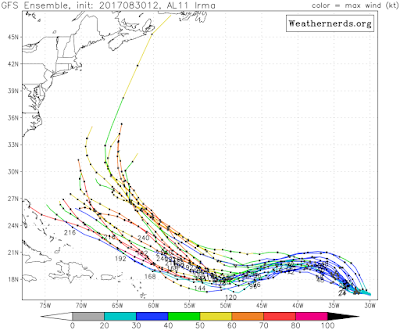 The smaller U.S. ensemble (GEFS) initialized at the same time is also bringing Irma towards the U.S., but has a greater tendency to bring to storm up the Atlantic coast.