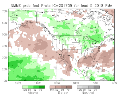 For those worried about wildfires next year, the news that we are entering an La Nina winter is a good tiding. La Nina winters tend to be wetter and cooler than normal. Furthermore, the latest NMME seasonal forecasts provided by NOAA for February through April are far cooler/wetter conditions (see forecasts below)