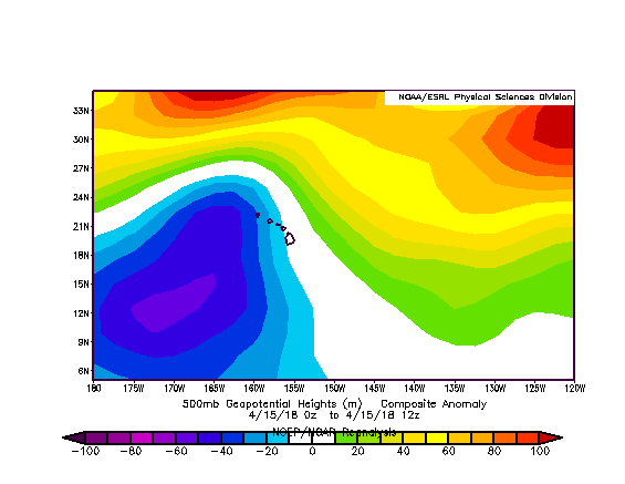 A significant upper level feature--an upper level trough--extended over Kauai during this event. This is shown by the upper level height anomaly for 500 hPa (about 18,000 ft) shown below.  The blue and purple colors show areas where heights and pressures are much lower than normal.  Troughs aloft are associated with upward motion and cool air in the lower portion of the atmosphere.