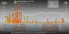 An excellent illustration of our firey and smoky past is found in this graphic produced by the Oregon Department of Forestry (OD) showing acres burned and number of fires from 1911 to 2017 (see below).