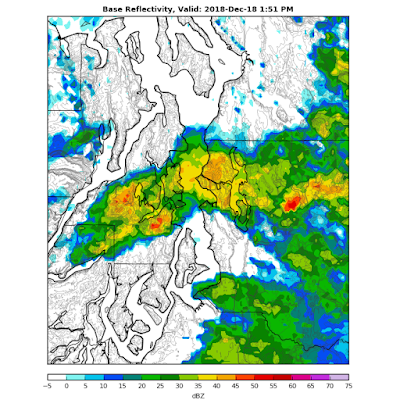 The first thing a meteorologist does in this situation is to look at the radar, and sure enough there was an area of high reflectivity (heavy precipitation) over Port Orchard at the time of the tornado (see radar image below for 1:51 PM). Such an area would be associated with a strong thunderstorm or convective cell. But you will note there were others at other locations that were equally as intense.