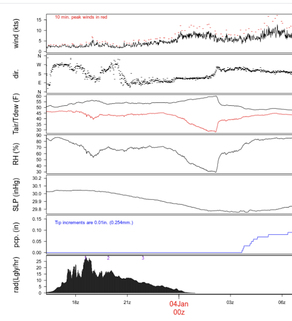 And there is more. The spike in temperature was associated with a surge of dry air, with relative humidity dropping to around 30%...something shown by the observations on top of the atmospheric sciences building at the UW (see below). Time is in UTC--0000 UTC 4 January is 4 PM Friday. Look at the third and fourth panels. Temperature rose to about 60F, dew point plunges to around 30F and relative humidity to 30%.