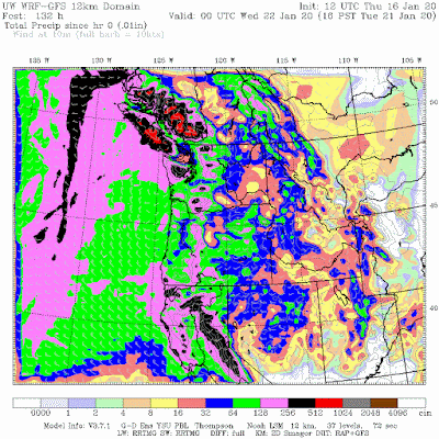 Much more water is coming! Here is the predicted precipitation through Tuesday at 4 PM, which shows wet conditions from California to British Columbia.