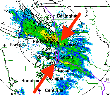 In the radar image above, the orange and red areas indicate heavy precipitation and small hail associated with strong convection, including embedded thunderstorms. Several have reported thunder. And there are major power outages in south Seattle that I suspect are due to the thunderstorm activity (see below)