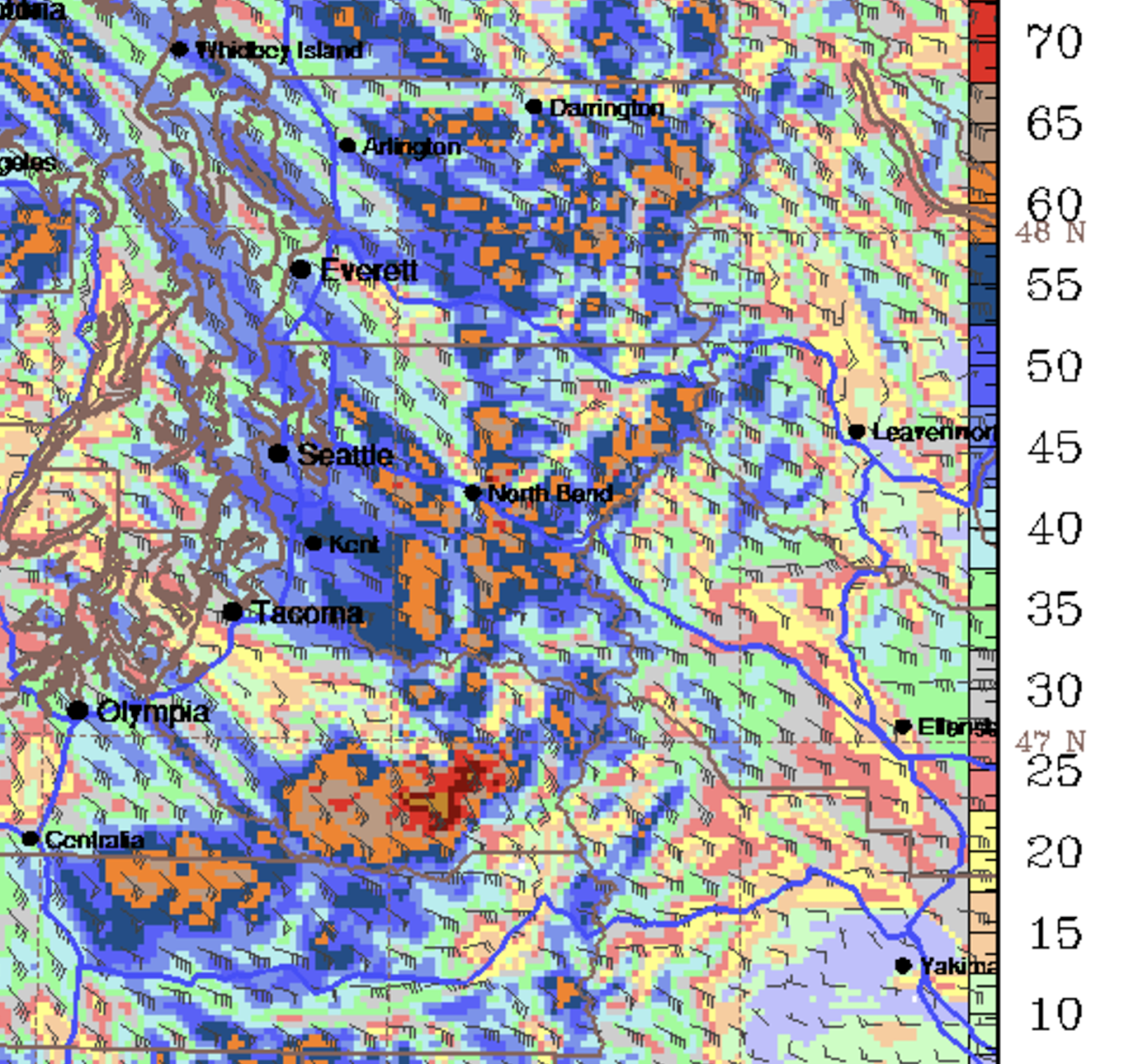 Examining the surface wind speed and direction at the same time for western Washington, you can see the strong winds (kt), indicated by orange and red colors. Look closely and you can see some waviness and non-uniformity in the winds.