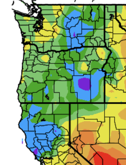 Starting with snowpack, Oregon is crazy above normal and Washington is modestly above normal overall (see percentages as of today, below). California is in good shape as well.
