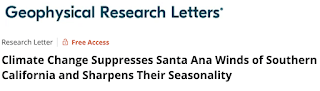 DeleteI have lived in SoCal for 60+ years. The Santa Anas we remember from childhood are the ones in September that pushed daytime temps to 110F and kept nighttime lows over 80F. There has not been a nighttime Los Angeles low over 80F since 1988. The continental "low-level cool air (cool air is denser and heavier than warm air), which will be warmed due to global warming" doesn't happen in September any more. I do not believe midwinter Santa Ana incidence has changed since I was a kid. But removing September from Santa Ana season is surely a reduction in overall fire risk.
